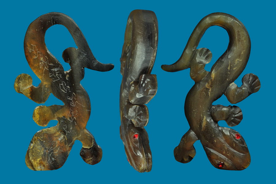 ชิ้นนี้ทำจากเขาสัตว์ ศิลปของอาจารย์กบ ตาฝังพลอยแดง หายาก เนื้อเขาหนา ด้านหลังเห็นเนื้อเขาปริเป็นชั้นๆ ง่ายต่อการพิจารณา ท้องจารมือ อะอิอะมะ และ อะมะอะอิ ขนาดยาว 3.5ซ.ม. จิ้งจกหลวงพ่อหน่ายถือเป็นของขลังดีทางมหาเสน่ห์ที่นิยมมากในปัจจุบัน ชิ้นนี้แท้แน่นอน ศิลปของอาจารย์กบดูง่ายเป็นธรรมชาตื ได้มาร่วม 10 ปีแล้วครับ ดูของชิ้นอื่นในร้านโปรดคลิ๊กที่ชื่อร้าน"ไม้ครู"ด้านล่างนี้ครับ