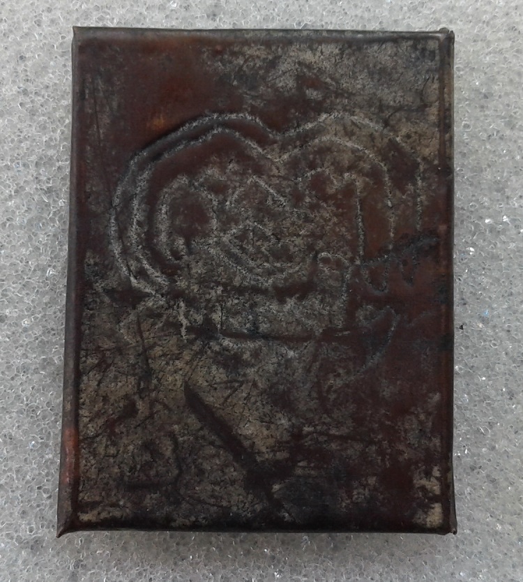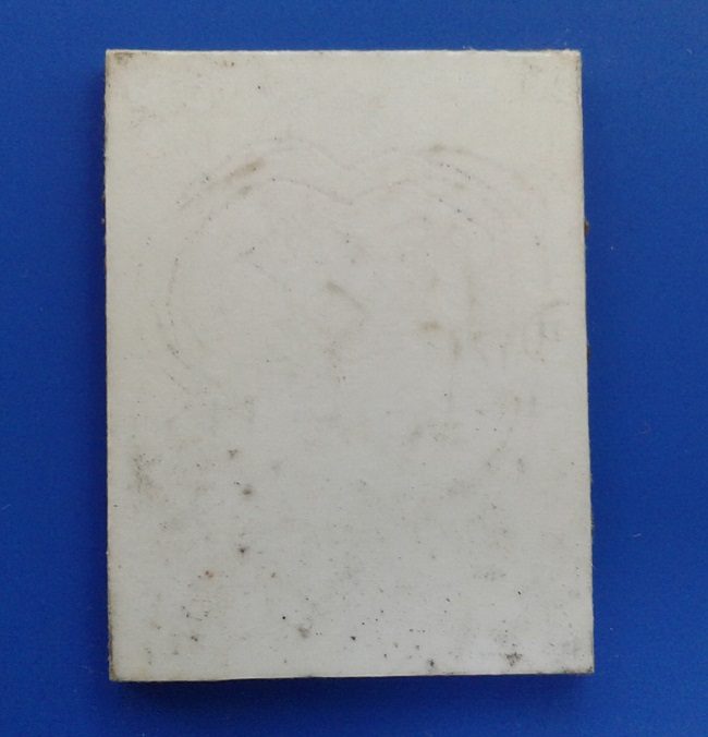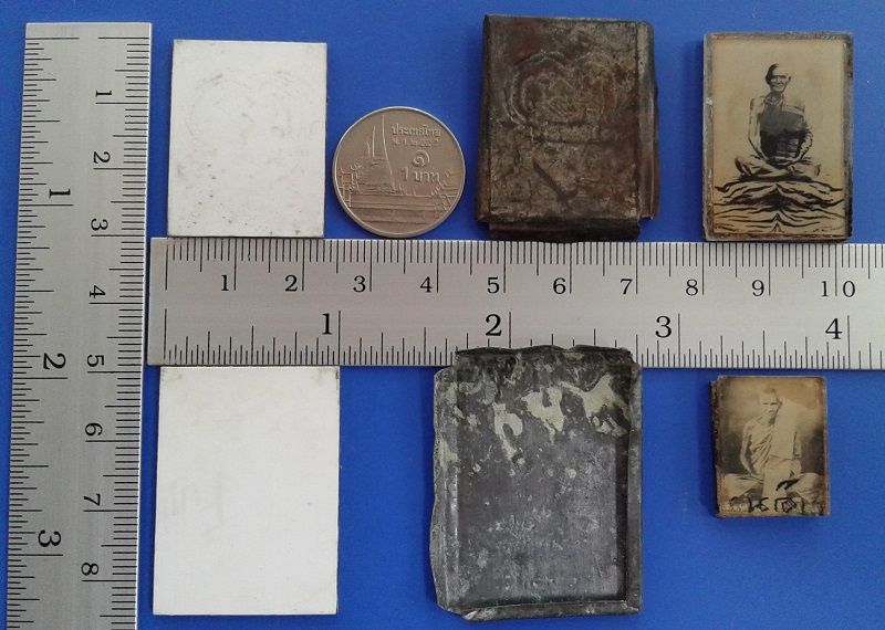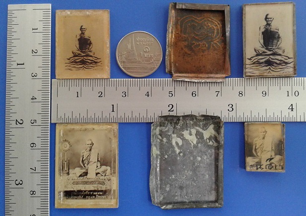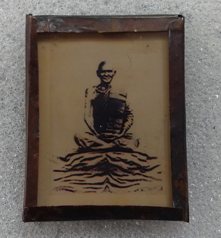 เป็นภาพถ่ายของหลวงพ่อเดิมนั่งบนหนังเสือราวๆปีพ.ศ.2457 เสือชื่ออ้ายเฒ่าข้ามแดนจากพม่ามาหากินแถวๆป่าทึบในอำเภอโกรกพระ โดนพรานต่างถิ่นนั่งห้างยิงเอา ภาพถ่ายนี้เป็นกระดาษจากฟิล์มอัดรูปรุ่นหลัง ไม่ใช่รุ่นแรกๆที่เรียกกันว่ากระดาษซีเปียนะครับ ซึ่งหลังพ.ศ.2482เป็นต้นมารูปถ่ายของหลวงพ่อเดิมก็ออกกันเรื่อยมาทั้งจากทางกรรมการวัดสร้างบ้าง,ชาวบ้านหรือประชาชนที่เคารพนับถือและศรัทธาในตัวท่านขอท่านสร้างก็มี เพราะภาพถ่ายมีต้นทุนที่ไม่แพงและสามารถทำขึ้นมาได้ง่ายและรวดเร็วขอให้มีแผ่นฟิล์มเนกาทีฟก็พอ ซึ่งช่วงนั้นร้านถ่ายรูปที่อ.ตาคลีก็เริ่มมีแล้วไม่ว่าจะเป็นร้านจำลองลักษณ์และร้านภาพไฉไล ขอให้เป็นวัตถุมงคลของท่านออกจากวัดหนองโพก็จะได้บารมีของท่านคุ้มครองปกปักรักษาผู้ที่เคารพนับถือและศรัทธาในตัวท่านก็เพียงพอแล้ว ก็แล้วแต่ความเชื่อของแต่ละบุคคลนะครับ ภาพนี้เป็นกระจก 1ด้านหุ้มด้วยแผ่นทองแดง ขนาดย่อมลงมาหน่อย กว้าง 2.2 ซ.ม.และยาว 3.0 ซ.ม.ส่วนความหนารวมอยู่ที่ประมาณ 1.6 ม.ม.ครับ ดูจากภาพประกอบได้ครับชอบใจก็ติดต่อมาพูดคุยได้ครับ