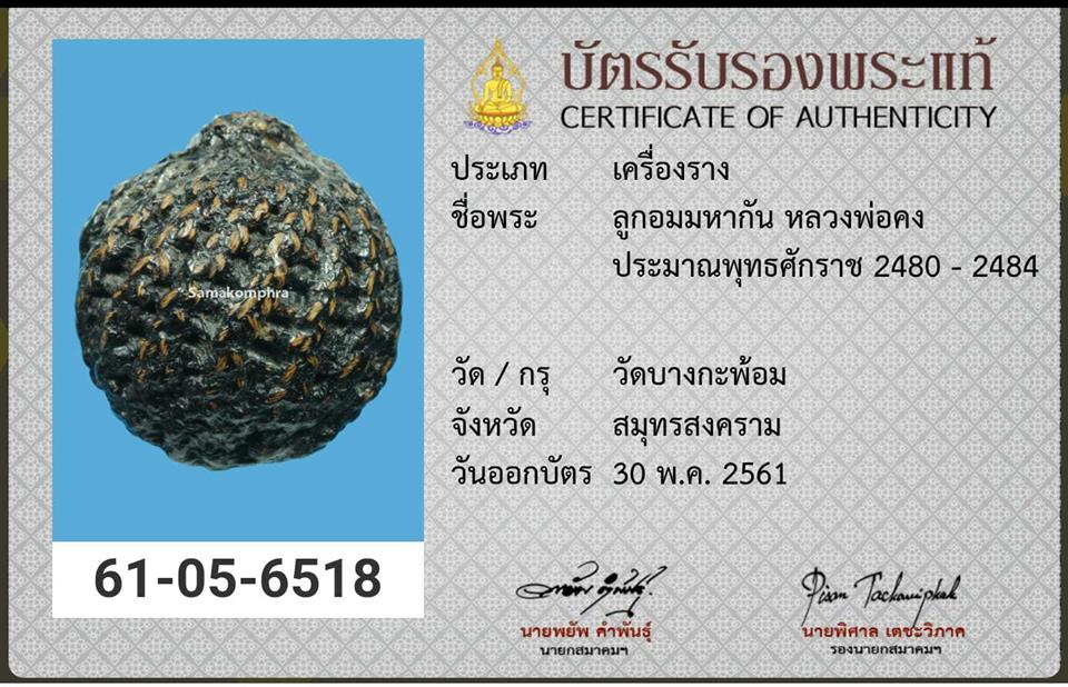 ลูกอมมหากัณฑ์ หลวงพ่อคง วัดบางกะพ้อม จ.สมุทรสงคราม พร้อมบัตรรับรองสมาคม เป็นอีก๑เครื่องรางอันศักดิ์สิทธิ์ ซึ่งยังเป็นที่นิยมใขว่คว้า ของบรรดาผู้ที่ชื่นชอบศรัทธา อย่างมากมาย หลวงพ่อคงท่านเป็นพระมหาเถราจารย์ชื่อดัง ในยุคสงครามอินโดจีน วัตถุมงคลของท่านแต่ละชนิด ติดอันดับ top ten มาโดยตลอด โดยเฉพาะเหรียญรุ่นแรก ปี ๒๔๘๔ ปัจจุบันเล่นหากันแสนแพง เป็น ๑ ในเบญจภาคีเหรียญของเมืองไทย หลวงพ่อท่าน สำเร็จวิชา นะปถมัง ซึ่งผู้ที่สำเร็จวิชานี้ได้จะต้องเชี่ยวชาญในกสินเป็นยิ่งยวดเลยทีเดียว คนเก่าแก่ในพื้นที่ ที่เกิดทันท่าน เล่าว่า ยามดึกสงัด ท่านจะทำพิธีเขียนอักขระลงบนกระดานชนวน แล้วลบเอาผงเก็บไว้ จนได้ปริมาณมาก แล้วก็นำผงนั้นไปผสมปั้นเป็นแท่ง นำมาเขียนอักขระอีก นับครั้งไม่ถ้วน จนมีเรื่องเล่าลือจากคนใกล้ชิดว่า ถึงขนาดเขียนไม่ต้องลบ ทะลุรอดกระดานเลย พอได้ฤกษ์ดี ท่านจึงนำมาปั้นเป็นลูกอม โดยเขียนอักขระ อะมหาอุตม์ลง บนกระดาษสา บรรจุไว้ในลูกอม ในยุคแรกๆท่านจะเป็นคนปั้นเองทั้งสิ้น ฉะนั้นจากประสบการณ์เคยเห็นลูกอม จากคนเก่าแก่ที่ได้รับมากับมือหลวงพ่อนั้น ส่วนมากลูกอมท่านจะเขื่องกว่าสำนักอื่นใด และค่อนข้างกลม ส่วนสีอมชมพูนั้น จะต้องมีสีอมกลืนกันทั้งลูก หากมองด้วยตาเปล่า และเปราะบาง เนื่องจากทำจากดินสอพองส่วนใหญ่ ไม่ใช่ส่องกล้องแล้ว มีจุดไรๆชมพูไม่กลืนกับเนื้อผง อาจจะมีลูกอมซึ่งผสมกับชานหมากบ้าง ค่อนข้างดำ แต่มักไม่ค่อยได้เห็นนัก ความศักดิ์สิทธิ์มากมายเหลือคณานับ บรรดาคนพื้นที่รู้ดี ลูกอมที่แท้ๆส่วนมาก ไม่แตก ก็ก็มีรอยขูดผงไปจนบาง เพราะนอกจากเรื่องกันสารพัดภัยแล้ว เรื่องด้านมหาเสน่ห์ไม่ต้องพูดถึง ถ้าได้เอาผงผสมน้ำให้สาวบ้านไหนกิน มีหวังไม่รอดทุกรายไปทีเดียว จนระยะหลัง หลวงพ่อคงท่านนำไปถ่วงน้ำพร้อมสีผึ้ง ที่ท่านทำทั้งหมด เพื่อไม่ให้คนไปใช้ในทางที่ผิด และปัจจุบันยังมีคนยืนยันเรื่องนี้ได้ ข้อห้าม ห้ามนำลูกอมนี้เข้าไปในที่อโคจรอย่างเด็ดขาด ลั่นแตกดังสนั่นคาตลับทุกราย