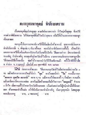 ตะกรุดมหาอุตม์พิชัยสงคราม รุ่นเงียบเสียง อาจารย์ชุม ไชยคีรี แผ่นยันต์ที่ใช้ทำตะกรุดทั้ง4แผ่น จะจารด้วยมือทั้ง2หน้า และทั้ง4แผ่นจะจารด้วยยันต์ไม่ซ้ำกันอีกทั้งยังมีผงพุทธคุณกับสมุนไพรว่านยาอยู่ข้างในม้วนแล้วพันผ้าแดงและร้อยเชือกพร้อมใช้เป็น1ในวัตถุมงคล3อย่าง ไทย สู้ไม่หนีทิ้งแผ่นดิน #พิธีปลุกเสกที่ถ้ำเสือ อ.ท่าม่วง จ.กาญจนบุรี เมื่อ 18 ก.พ.2521 และเสกในพรรษาปี2524อีกครั้ง#ท่านว่าเหมาะแก่นักรบสมัยโบราณและนักรบปัจจุบัน พระอาจารย์ผู้มีความรู้ ทำพิธีตามฤกษ์ยามพิชัยยุทธเพื่อเป็นสิริมงคลแก่ผู้ใช้ที่ยึดมั่นในคุณพระและคุณอาจารย์ สูงสุดในด้านกำจัดภัยนานาชนิด กันอาวุธทุกชนิดของศัตรูไม่เข้าใกล้กาย เป็นตะกรุดที่มีคุณวิเศษสูงสุดหมายความว่ายิ่งใหญ่หรือสูงสุดที่เคยใช้ในตำราพิชัยสงคราม ไม่ใช่มหาอุตม์ที่เข้าใจกันว่าอุดลาภ หรือไว้ที่บ้านเวลาภรรยาคลอดลูกต้องเอาออก ตะกรุดมหาอุตม์พิชัยสงคราม นี้ท่านได้เรียนมาจากอาจารย์ภาคใต้ ที่มีชื่อเสียงถึงห้าอาจารย์ ทุกอาจารย์เรียนจากสำนักวัดเขาอ้อ พัทลุงต่อๆกันมาทั้งหมด **ก่อนคาดเข้าที่สะเอว ให้เอาตะกรุดใส่เข้าในมือประนมมือว่า นะโม 3 จบ แล้วหลับตาภาวนาหายใจเข้านึกว่า พุท หายใจออกนึกว่า โธ จากนั้นภาวนา ภะคะวาสุคะโต อะระหัง หลายๆจบแล้วคาดที่สะเอวทั้งๆที่หลับตา คาดเสร็จแล้วเอามือขวาปิดบนกระหม่อม เอาหัวแม่มือซ้ายกดสะดืออึดใจภาวนา นะอุอะมิ จำนวน 3 อึดใน เมื่อคาดแล้วไปไหนมาไหนไม่ต้องเอาออก เว้นแต่นอนร่วมกับผู้หญิงเท่านั้นที่ต้องเอาออก ห้ามทดลองทำเป็นเล่น เข้าที่คับขันภาวนา ภะคะวา สุคะโต อะระหัง กำบังตาศัตรู กันอาวุธทุกชนิด วิเศษสูงสุด ใช้ได้ทั้งผู้ชายและผู้หญิง ดอกเดียวกันได้เฉพาะตัวเอง 4 ดอกกันได้ถึงบริวารที่อยู่รอบๆตัวเรา ตะกรุดพิชัยสงครามนั้น ท่านอ.ชุม ได้สร้าง มาตั้งแต่ยุคต้นๆเลยครับตั้งแต่ท่านอยุ่ที่สำนักไสยศาสตร์ ที่เขาชัยสน พัทลุง ท่านได้สร้างเครื่องรางไว้หลายอย่าง เช่นตะกรุดหัวใจมหาบุรุต8จำพวกจารมือ/ ตะกรุดกำเนิด3 /น้ำมันมหานิยม/ ผงว่านพญาเทครัวและผงว่านทางเมตตาต่างๆเรียกว่าผงมหาราช/ตะกรุดทิศมรมหาลาภ/ผ้ายันต์ธรรมราชยุคต้น/ผ้ายันต์เขียนมือต่างๆแม้แต่ผ้ายันต์เพดานท่านก็สร้าง/แลตะกรุดพิชัยสงครามได้สร้างตั้งแต่1ดอก 2ดอก 4ดอก และก็5ดอก ที่มีการสร้างในหนังสือที่ระลึกงานพระราชธานเพลิงศพ หลวงพ่อคงวัดบ้านสวนที่ท่าน อ.ชุมได้บันทึกไว้ แต่เครื่องรางยุคต้นนั้นก็ไม่เป็นสากลนิยมเท่าไหร่เพราะว่ารูปแบบในการสร้างไม่เป็นมาตราฐานลักษณะแตกต่างกันไ