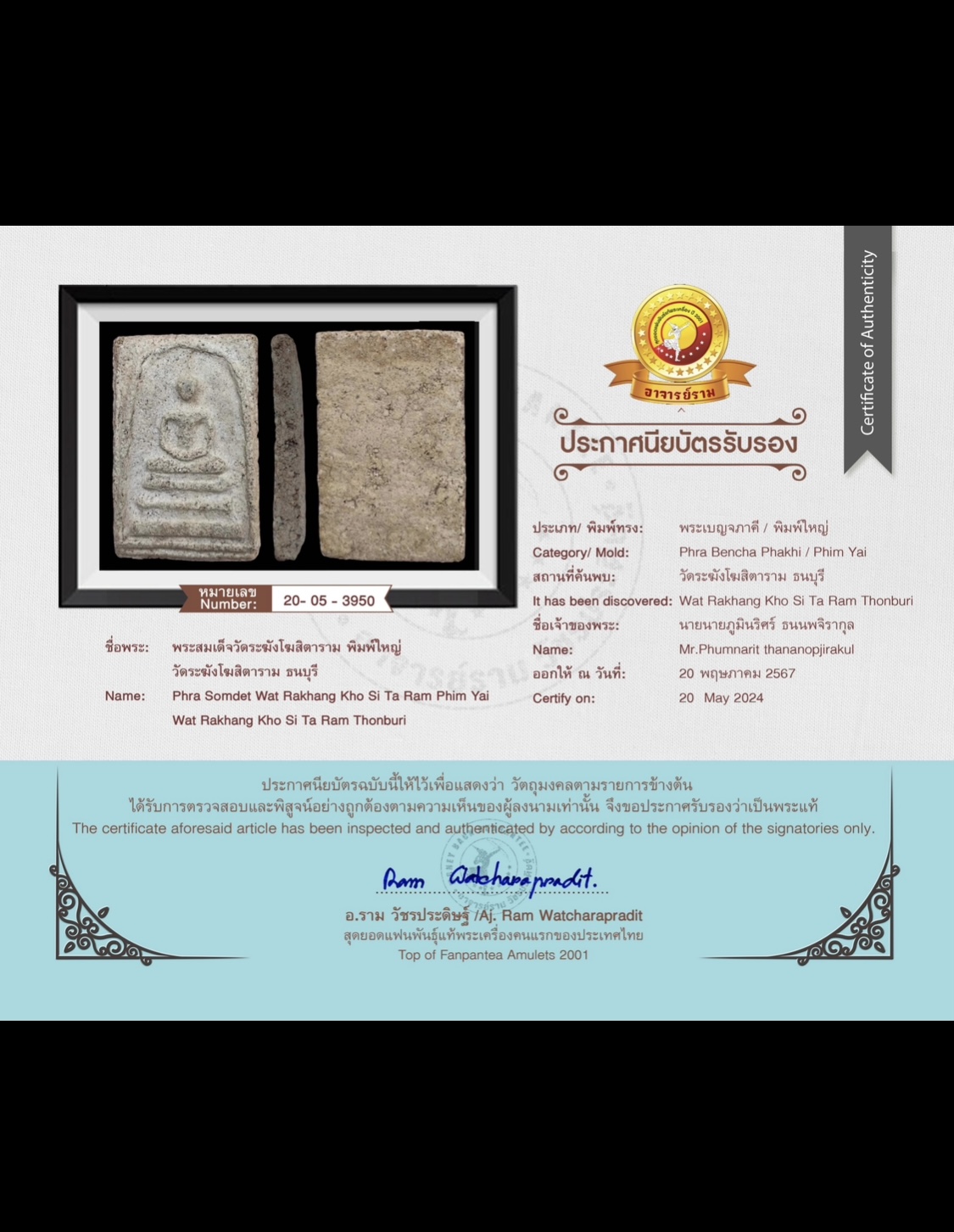 พระสมเด็จวัดระฆังพิมพ์ใหญ่ พร้อมบัตรรับรองพระแท้จากอาจารย์ราม วัชรประดิษฐ์ แฟนพันธุ์แท้พระเครื่องคนแรกของประเทศไทยปี 2001