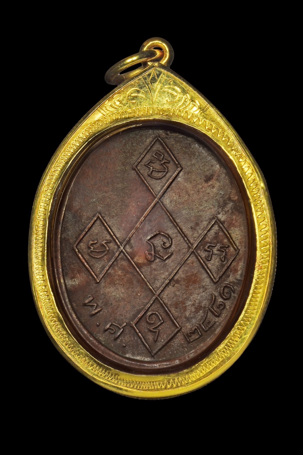 ด้านหลัง ยกขอบโดยรอบ ตรงกลางเป็นยันต์ ภายในบรรจุอักขระขอมว่า “มิ มะ นะ อะ อุ”