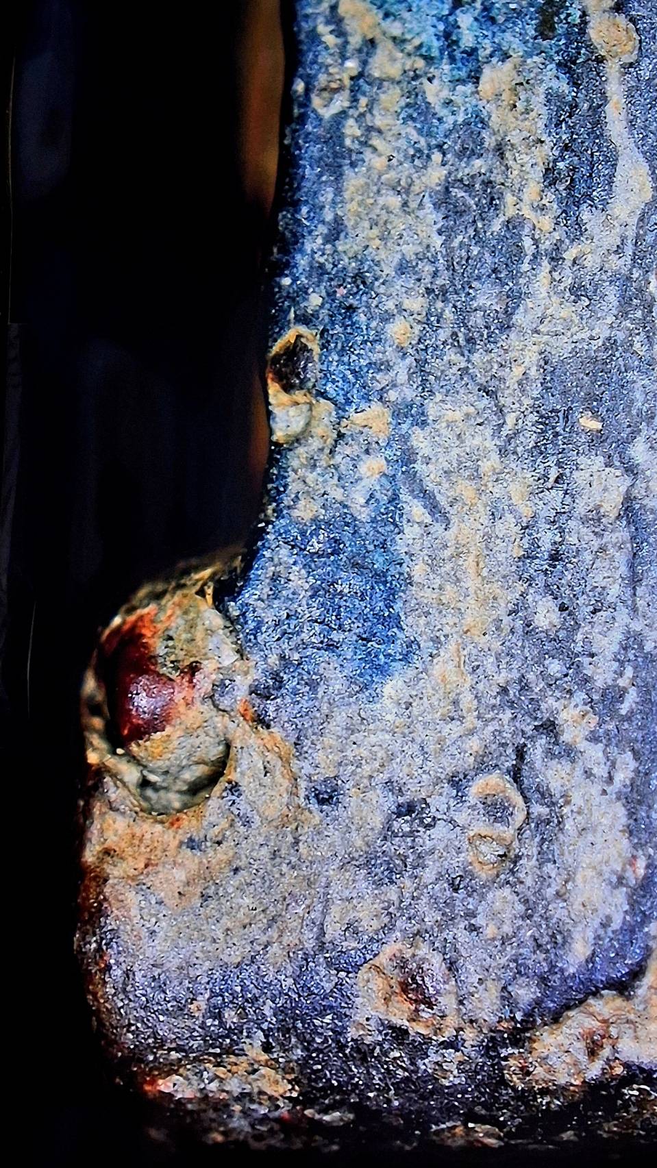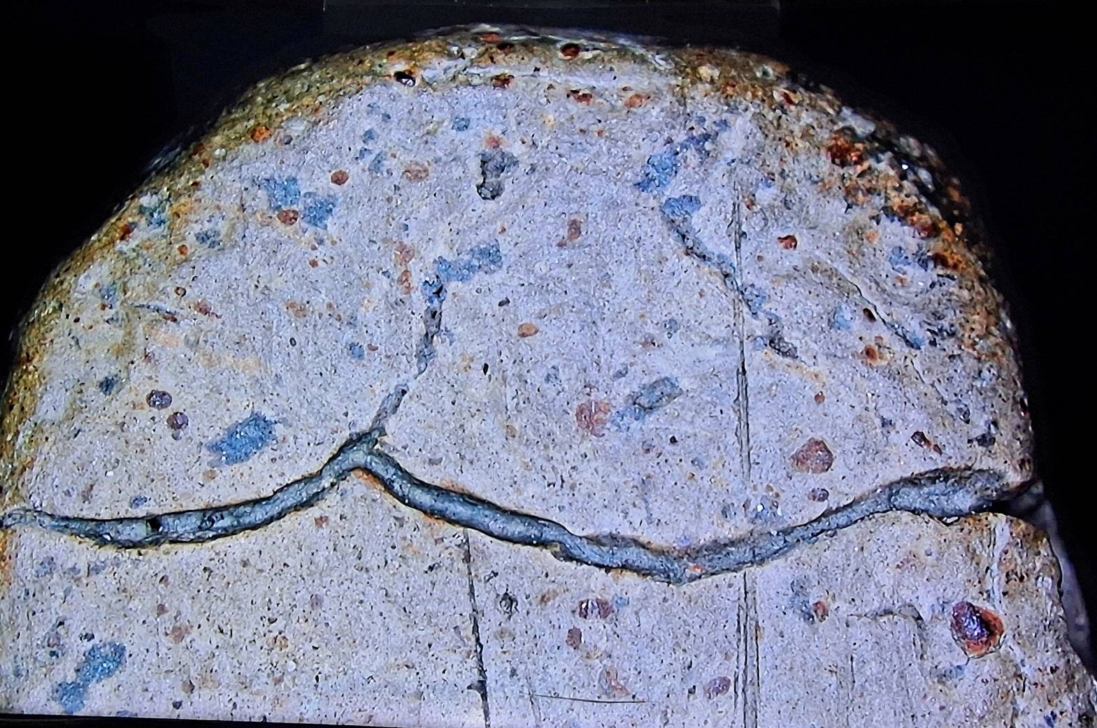 ในรอยปริแยก ผมเห็น "จุดสีแดงเข้ม" (แร่ดอกมะขาม) และ "เม็ดทรายสีขาวขุ่น" ฝังตัวอยู่ประปราย