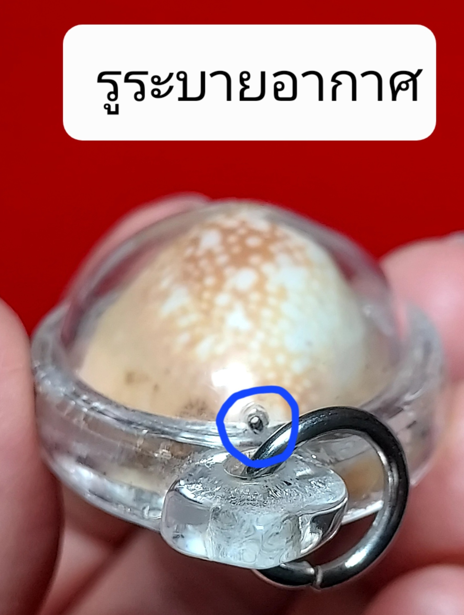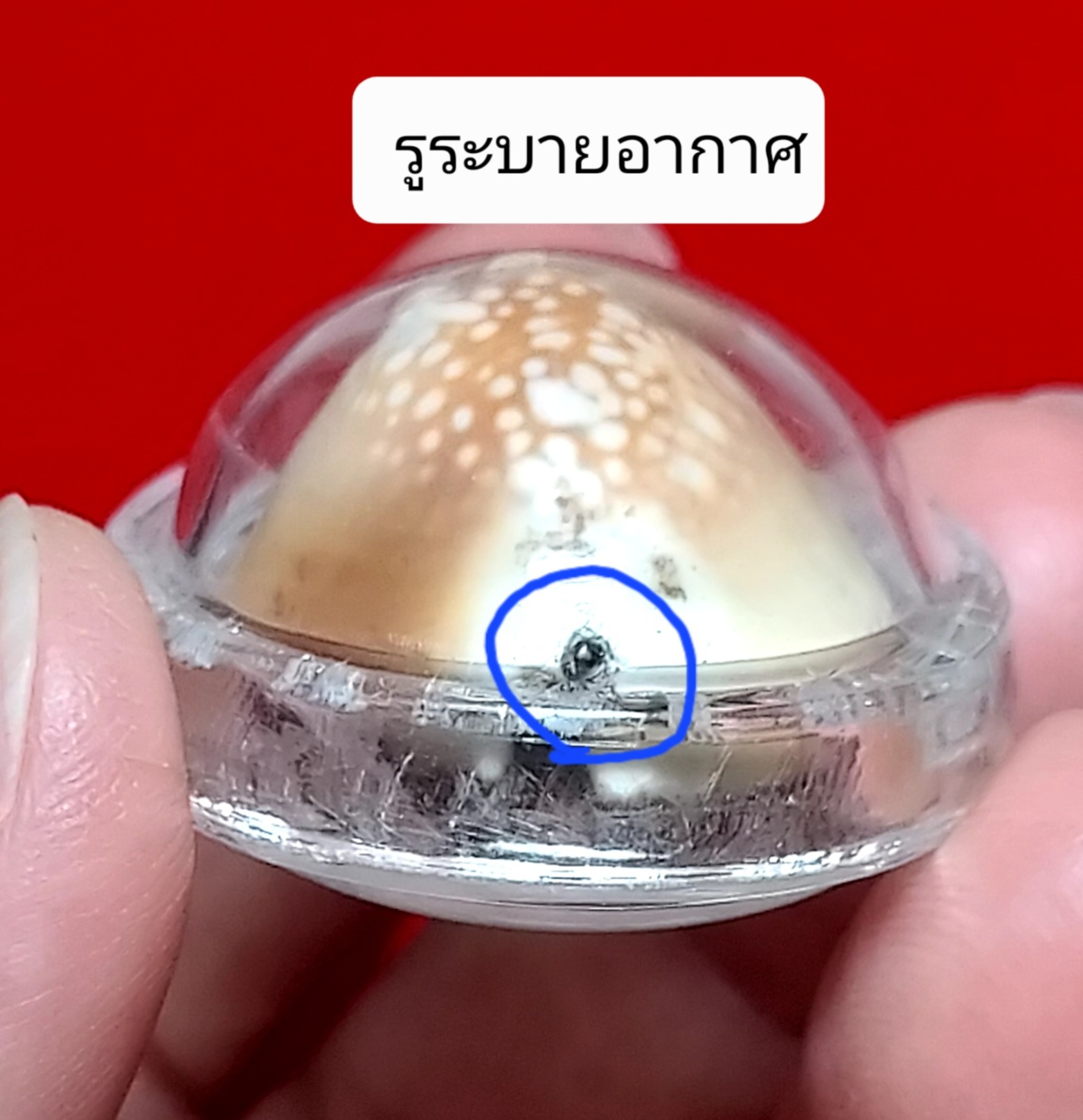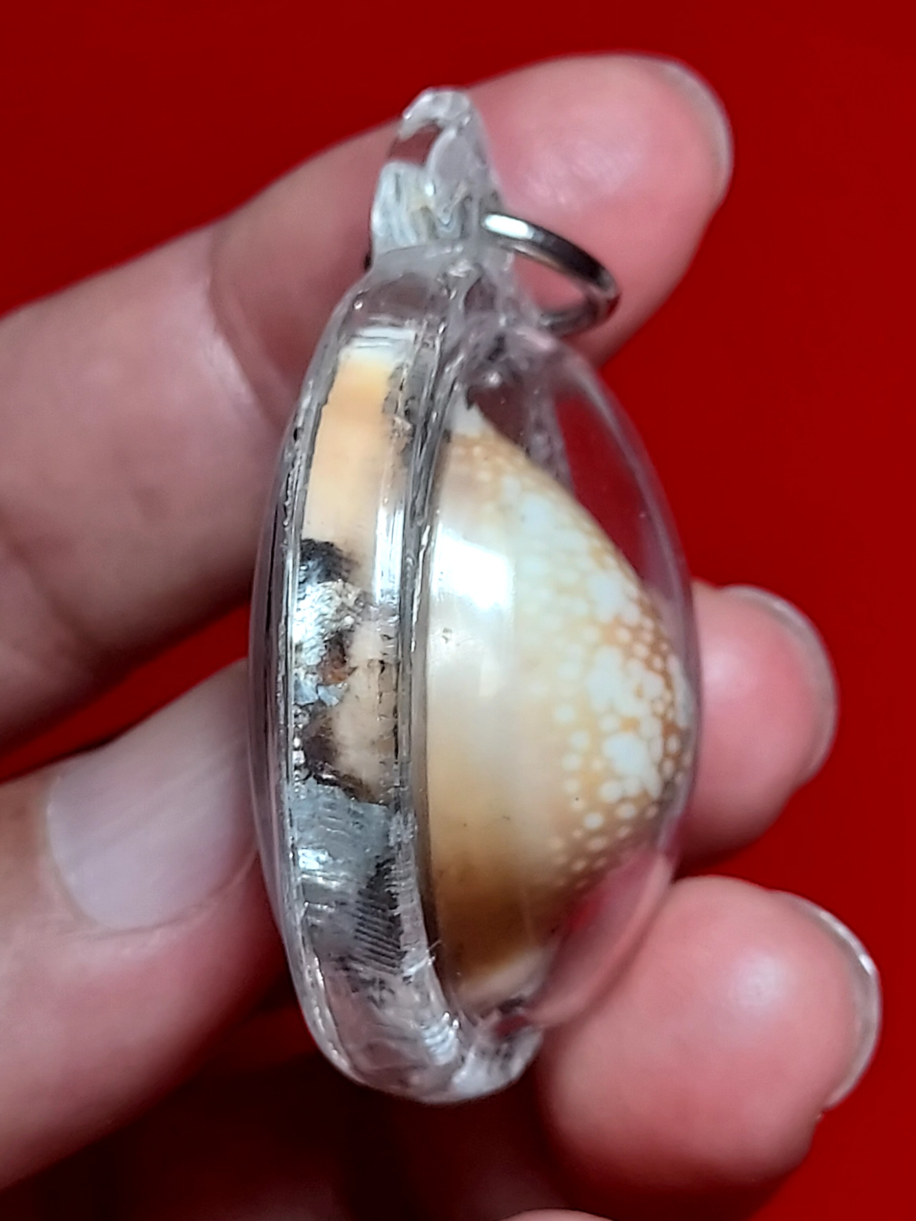 ปกติเบี้ยแก้ที่บรรจุปรอท หากนำไปลี่ยมกรอบพลาสติก ต้องระมัดระวังเรื่องของปรอทรั่ว เพราะส่วนใหญ่ ถ้าช่างเลี่ยมไม่เคยเลี่ยมหรือไม่ชำนาญจริง ปรอทมักจะรั่วออก เนื่องจากความร้อนในขณะเลี่ยม แต่เบี้ยตัวนี้ ช่างได้เจาะรูที่กรอบพลาสติกทั้งด้านบนและล่าง เพื่อระบายความร้อนขณะเลี่ยม ทำให้ไม่มีปรอทรั่ว