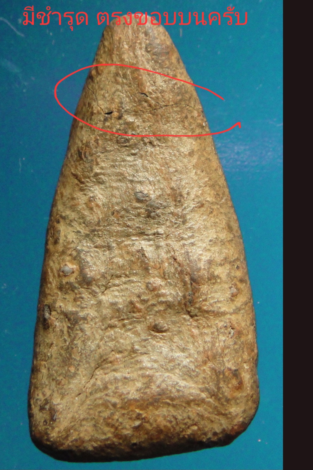 พระองค์นี้ เนื้อแกร่งเหมือนหิน เป็นพระเนื้อองค์ครูได้เลยครับ. เม็ดแร่ผุดส่องแล้วทำให้ย้อนเวลาได้เลยเลย ว่าเก่าได้อายุ จริงๆ ด้านหลังองค์ เนื้อผิวพระ เหี่ยว ยุบ ย่น เก่าถึงยุค ครับ . พระองค์นี้หักตรงส่วน บน ครับ.